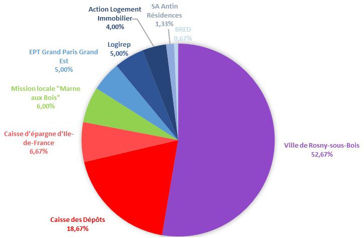 Actionnariat : Ville de Rosny-sous-Bois (52.67 %), Caisse des Dépôts & Consignations (18.67 %) - Autres actionnaires privés -LOGIREP, la Caisse d’Epargne, GPGE…- (28.67 %)